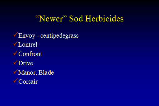 “Newer” Sod Herbicides<BR>Envoy - centipedegrass <BR>Lontrel  <BR>Confront  <BR>Drive <BR>Manor, Blade <BR>Corsair<BR>