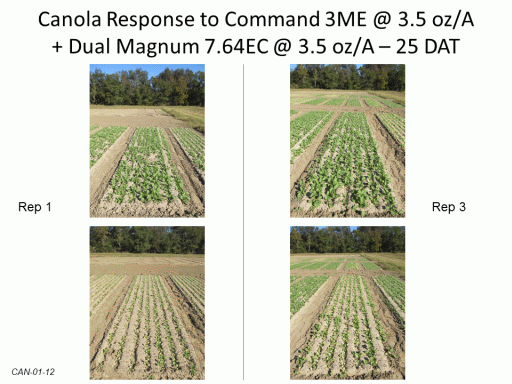 Canola Response to Command 3ME @ 3.5 oz/A + Dual Magnum 7.64EC @ 3.5 oz/A – 25 DAT<BR>Rep 1<BR>Rep 3<BR>CAN-01-12<BR>