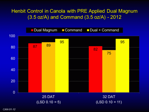 Henbit Control in Canola with PRE Applied Dual Magnum (3.5 oz/A) and Command (3.5 oz/A) - 2012<BR>CAN-01-12<BR>(LSD 0.10 = 5)<BR>(LSD 0.10 = 11)<BR>