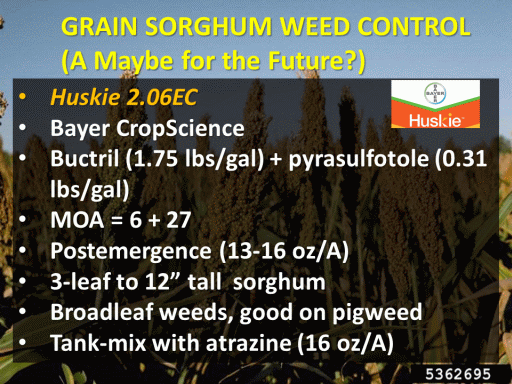 GRAIN SORGHUM WEED CONTROL <BR>(A Maybe for the Future?)<BR>Huskie 2.06EC <BR>Bayer CropScience <BR>Buctril (1.75 lbs/gal) + pyrasulfotole (0.31 lbs/gal) <BR>MOA = 6 + 27 <BR>Postemergence (13-16 oz/A) <BR>3-leaf to 12” tall  sorghum <BR>Broadleaf weeds, good on pigweed <BR>Tank-mix with atrazine (16 oz/A)<BR>