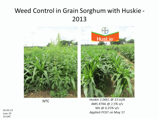 Weed Control in Grain Sorghum with Huskie - 2013<BR>SG-02-13 <BR>June 19 <BR>33 DAT<BR>NTC<BR>Huskie 2.06EC @ 13 oz/A <BR>AMS XTRA @ 2.5% v/v <BR>NIS @ 0.25% v/v <BR>Applied POST on May 17<BR>