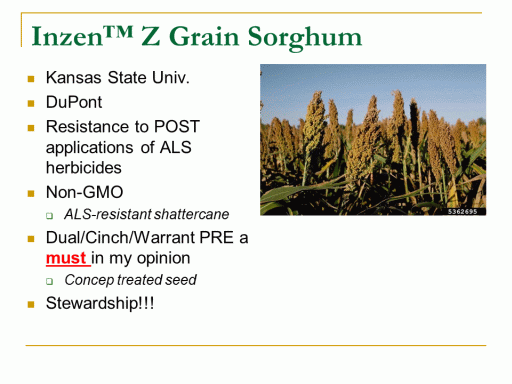 Inzen™ Z Grain Sorghum<BR>Kansas State Univ. <BR>DuPont <BR>Resistance to POST applications of ALS herbicides <BR>Non-GMO <BR>ALS-resistant shattercane <BR>Dual/Cinch/Warrant PRE a must in my opinion <BR>Concep treated seed <BR>Stewardship!!! <BR>