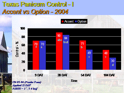 Texas Panicum Control - I Accent vs Option - 2004<BR>CN-03-04 (Ponder Farm) <BR>Applied 22 DAP <BR>PANTE = 1”, 3-4 leaf<BR>a<BR>a<BR>abc<BR>bcd<BR>b<BR>c<BR>c<BR>d<BR>