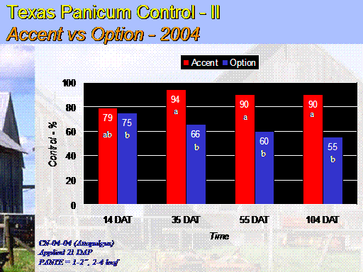 Texas Panicum Control - II Accent vs Option - 2004<BR>CN-04-04 (Attapulgus) <BR>Applied 21 DAP <BR>PANTE = 1-2”, 2-4 leaf<BR>ab<BR>b<BR>a<BR>b<BR>a<BR>b<BR>a<BR>b<BR>