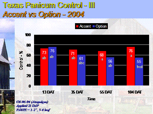 Texas Panicum Control - III Accent vs Option - 2004<BR>CN-06-04 (Attapulgus) <BR>Applied 21 DAP <BR>PANTE = 1-2”, 3-4 leaf<BR>ab<BR>ab<BR>ab<BR>abc<BR>a<BR>ab<BR>a<BR>bcd<BR>