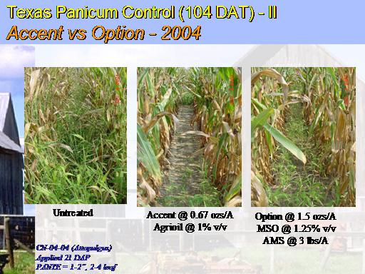 Texas Panicum Control (104 DAT) - II Accent vs Option - 2004<BR>CN-04-04 (Attapulgus) <BR>Applied 21 DAP <BR>PANTE = 1-2”, 2-4 leaf<BR>Untreated<BR>Accent @ 0.67 ozs/A <BR>Agrioil @ 1% v/v<BR>Option @ 1.5 ozs/A <BR>MSO @ 1.25% v/v <BR>AMS @ 3 lbs/A<BR>