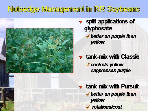 Nutsedge Management in RR Soybeans<BR> split applications of glyphosate <BR>better on purple than yellow <BR> <BR> tank-mix with Classic  <BR>controls yellow suppresses purple  <BR> <BR> tank-mix with Pursuit <BR>better on purple than yellow <BR> rotations/cost<BR>