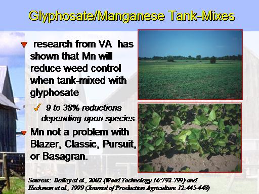 Glyphosate/Manganese Tank-Mixes<BR> research from VA  has shown that Mn will reduce weed control when tank-mixed with glyphosate <BR> 9 to 38% reductions depending upon species <BR>Mn not a problem with Blazer, Classic, Pursuit, or Basagran.<BR>Sources:  Bailey et al., 2002 (Weed Technology 16:792-799) and  <BR>Heckman et al., 1999 (Journal of Production Agriculture 12:445-448)<BR>