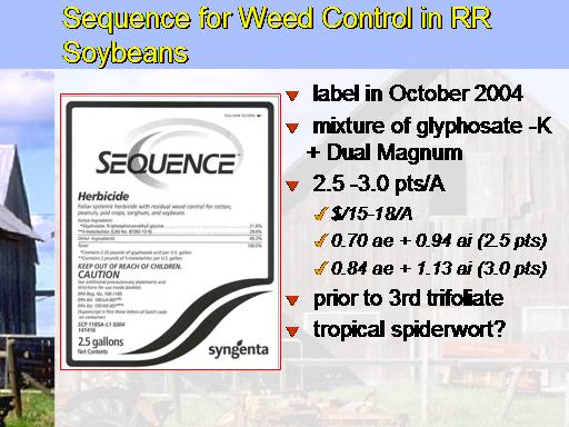 Sequence for Weed Control in RR Soybeans<BR> label in October 2004 <BR> mixture of glyphosate -K + Dual Magnum <BR> 2.5 -3.0 pts/A <BR>$/15-18/A <BR>0.70 ae + 0.94 ai (2.5 pts) <BR>0.84 ae + 1.13 ai (3.0 pts) <BR> prior to 3rd trifoliate <BR> tropical spiderwort?<BR>