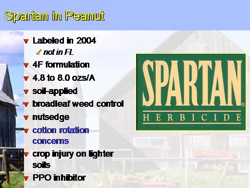 Spartan in Peanut<BR>Labeled in 2004 <BR>not in FL <BR>4F formulation <BR>4.8 to 8.0 ozs/A <BR>soil-applied <BR>broadleaf weed control <BR>nutsedge <BR>cotton rotation concerns <BR>crop injury on lighter soils <BR>PPO inhibitor<BR>