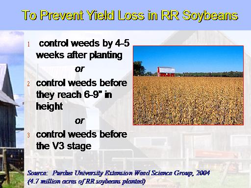 To Prevent Yield Loss in RR Soybeans<BR> control weeds by 4-5 weeks after planting <BR>or <BR>control weeds before they reach 6-9” in height <BR>or <BR>control weeds before the V3 stage<BR>Source:  Purdue University Extension Weed Science Group, 2004 <BR>(4.7 million acres of RR soybeans planted)<BR>