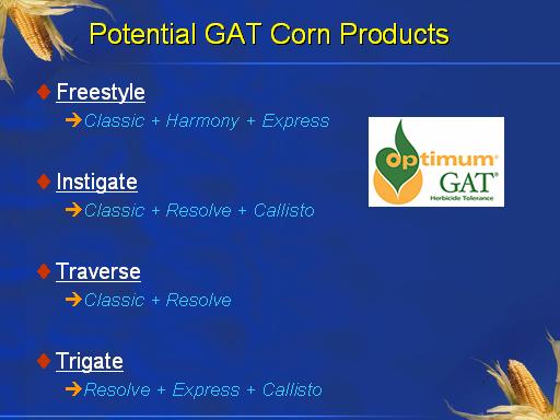 Potential GAT Corn Products<BR>Freestyle <BR>Classic + Harmony + Express <BR> <BR>Instigate <BR>Classic + Resolve + Callisto <BR> <BR>Traverse <BR>Classic + Resolve <BR> <BR>Trigate <BR>Resolve + Express + Callisto <BR>