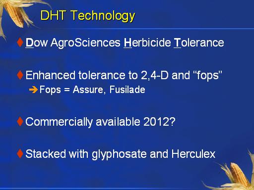DHT Technology<BR>Dow AgroSciences Herbicide Tolerance <BR> <BR>Enhanced tolerance to 2,4-D and “fops” <BR>Fops = Assure, Fusilade <BR> <BR>Commercially available 2012?  <BR> <BR>Stacked with glyphosate and Herculex<BR>