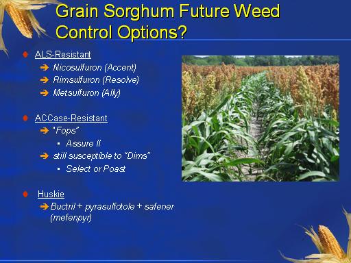 Grain Sorghum Future Weed Control Options?<BR>ALS-Resistant <BR> Nicosulfuron (Accent) <BR> Rimsulfuron (Resolve) <BR> Metsulfuron (Ally) <BR> <BR>ACCase-Resistant <BR> “Fops” <BR>Assure II <BR> still susceptible to “Dims” <BR>Select or Poast <BR> <BR> Huskie <BR>Buctril + pyrasulfotole + safener (mefenpyr)<BR>