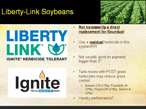 Liberty-Link Soybeans<BR>Not necessarily a direct replacement for Roundup! <BR> <BR>Use a residual herbicide in this system!!!!!!! <BR> <BR>Not usually good on pigweed bigger than 3” <BR> <BR>Tank-mixes with POST grass herbicides may reduce grass control   <BR>Assure (10-21%); Fusilade (8-12%); Poast (25-41%); Select 4-22%) <BR>Variety performance? <BR>