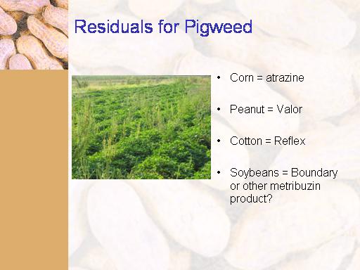 Residuals for Pigweed<BR>Corn = atrazine <BR> <BR>Peanut = Valor <BR> <BR>Cotton = Reflex <BR> <BR>Soybeans = Boundary or other metribuzin product?<BR>
