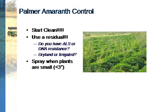 Palmer Amaranth Control<BR>Start Clean!!!!! <BR>Use a residual!!! <BR>Do you have ALS or DNA resistance? <BR>Dryland or Irrigated? <BR>Spray when plants are small (<3”)<BR>
