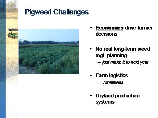 Pigweed Challenges<BR>Economics drive farmer decisions <BR> <BR>No real long-term weed mgt. planning  <BR>just make it to next year <BR> <BR>Farm logistics <BR>Timeliness <BR> <BR>Dryland production systems<BR>