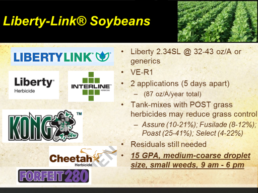 Liberty-LinkŪ Soybeans<BR>Liberty 2.34SL @ 32-43 oz/A or generics <BR>VE-R1 <BR>2 applications (5 days apart) <BR> (87 oz/A/year total) <BR>Tank-mixes with POST grass herbicides may reduce grass control   <BR>Assure (10-21%); Fusilade (8-12%); Poast (25-41%); Select (4-22%) <BR>Residuals still needed <BR>15 GPA, medium-coarse droplet size, small weeds, 9 am - 6 pm <BR> <BR>