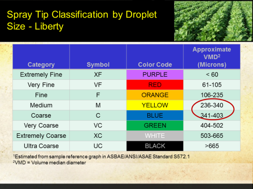 Spray Tip Classification by Droplet Size - Liberty<BR>1Estimated from sample reference graph in ASBAE/ANSI/ASAE Standard S572.1 <BR>2VMD = Volume median diameter<BR>