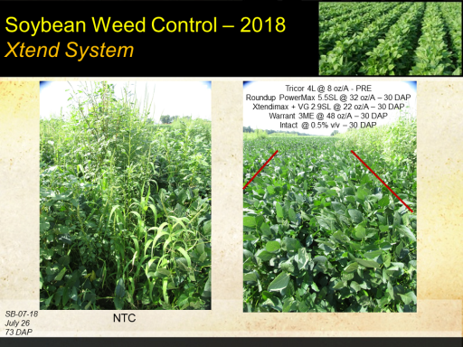 Soybean Weed Control – 2018 Xtend System<BR>SB-07-18 <BR>July 26 <BR>73 DAP<BR>NTC<BR>Tricor 4L @ 8 oz/A - PRE <BR>Roundup PowerMax 5.5SL @ 32 oz/A – 30 DAP <BR>Xtendimax + VG 2.9SL @ 22 oz/A – 30 DAP <BR>Warrant 3ME @ 48 oz/A – 30 DAP <BR>Intact @ 0.5% v/v – 30 DAP <BR>