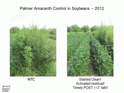 Palmer Amaranth Control in Soybeans – 2012<BR>SB-10-12 <BR>August 9 <BR>78 DAP<BR>NTC<BR>Started Clean! <BR>Activated residual! <BR>Timely POST (<3” tall)!<BR>