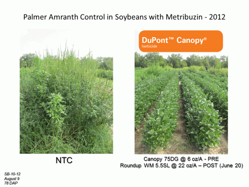 Palmer Amranth Control in Soybeans with Metribuzin - 2012<BR>SB-10-12 <BR>August 9 <BR>78 DAP<BR>NTC<BR>Canopy 75DG @ 6 oz/A - PRE <BR>Roundup WM 5.5SL @ 22 oz/A – POST (June 20)<BR>