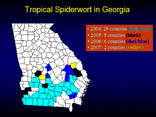 Tropical Spiderwort in Georgia<BR> 2004: 29 counties (light blue) <BR> 2005: 5 counties (black) <BR> 2006: 6 counties (dark blue) <BR> 2007: 2 counties (yellow)<BR>