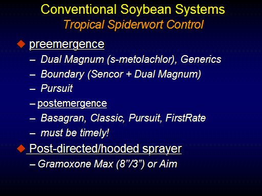 Conventional Soybean Systems Tropical Spiderwort Control<BR> preemergence <BR> Dual Magnum (s-metolachlor), Generics <BR> Boundary (Sencor + Dual Magnum) <BR> Pursuit <BR>postemergence <BR> Basagran, Classic, Pursuit, FirstRate <BR> must be timely! <BR> Post-directed/hooded sprayer <BR>Gramoxone Max (8’’/3”) or Aim<BR>