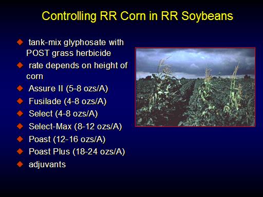 Controlling RR Corn in RR Soybeans<BR> tank-mix glyphosate with POST grass herbicide <BR> rate depends on height of corn <BR> Assure II (5-8 ozs/A) <BR> Fusilade (4-8 ozs/A) <BR> Select (4-8 ozs/A) <BR> Select-Max (8-12 ozs/A) <BR> Poast (12-16 ozs/A) <BR> Poast Plus (18-24 ozs/A) <BR> adjuvants <BR>
