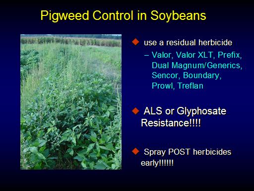 Pigweed Control in Soybeans<BR> use a residual herbicide <BR>Valor, Valor XLT, Prefix, Dual Magnum/Generics, Sencor, Boundary, Prowl, Treflan <BR> <BR> ALS or Glyphosate Resistance!!!! <BR> <BR> Spray POST herbicides early!!!!!!<BR>
