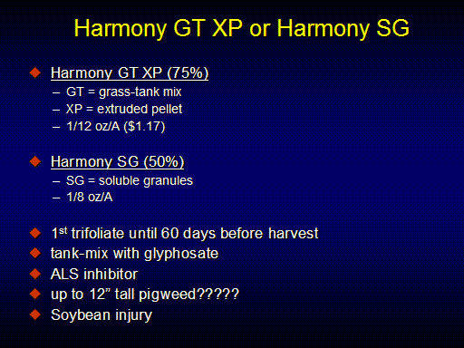 Harmony GT XP or Harmony SG<BR> Harmony GT XP (75%) <BR>GT = grass-tank mix <BR>XP = extruded pellet <BR>1/12 oz/A ($1.17) <BR> <BR> Harmony SG (50%) <BR>SG = soluble granules <BR>1/8 oz/A <BR> <BR> 1st trifoliate until 60 days before harvest <BR> tank-mix with glyphosate <BR> ALS inhibitor <BR> up to 12” tall pigweed????? <BR> Soybean injury <BR> <BR>