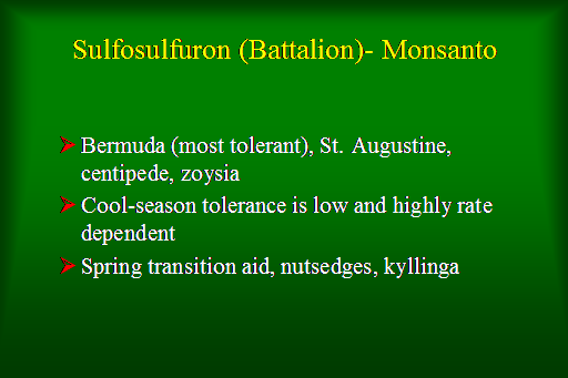 Sulfosulfuron (Battalion)- Monsanto<BR>Bermuda (most tolerant), St. Augustine, centipede, zoysia