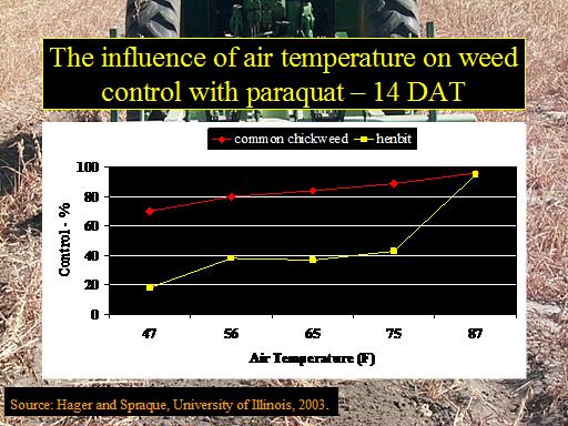 The influence of air temperature on weed control with paraquat – 14 DAT<BR>Source: Hager and Spraque, University of Illinois, 2003.<BR>