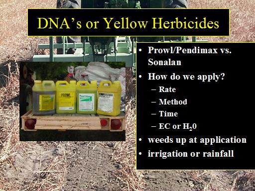DNA’s or Yellow Herbicides<BR>Prowl/Pendimax vs. Sonalan <BR>How do we apply? <BR>Rate <BR>Method <BR>Time <BR>EC or H20 <BR>weeds up at application <BR>irrigation or rainfall<BR>