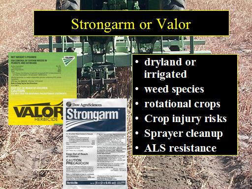 Strongarm or Valor<BR>dryland or irrigated <BR>weed species <BR>rotational crops <BR>Crop injury risks <BR>Sprayer cleanup <BR>ALS resistance<BR>