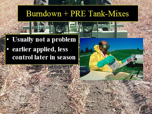 Burndown + PRE Tank-Mixes<BR>Usually not a problem <BR>earlier applied, less control later in season<BR>