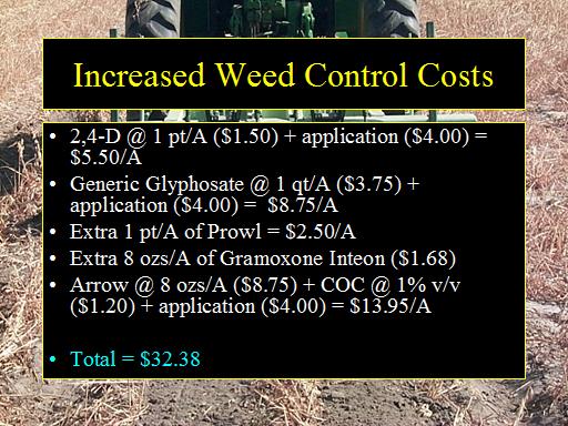 Increased Weed Control Costs<BR>2,4-D @ 1 pt/A ($1.50) + application ($4.00) =  $5.50/A <BR>Generic Glyphosate @ 1 qt/A ($3.75) + application ($4.00) =  $8.75/A <BR>Extra 1 pt/A of Prowl = $2.50/A <BR>Extra 8 ozs/A of Gramoxone Inteon ($1.68) <BR>Arrow @ 8 ozs/A ($8.75) + COC @ 1% v/v ($1.20) + application ($4.00) = $13.95/A <BR> <BR>Total = $32.38<BR>