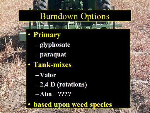 Burndown Options<BR>Primary <BR>glyphosate <BR>paraquat <BR>Tank-mixes <BR>Valor <BR>2,4-D (rotations) <BR>Aim - ???? <BR>based upon weed species<BR>