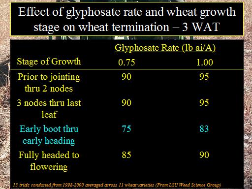 Effect of glyphosate rate and wheat growth stage on wheat termination – 3 WAT<BR>15 trials conducted from 1998-2000 averaged across 11 wheat varieties (From LSU Weed Science Group)<BR>