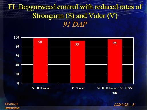 FL Beggarweed control with reduced rates of Strongarm (S) and Valor (V)91 DAP<BR>PE-09-02