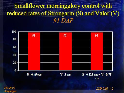 Smallflower morningglory control with reduced rates of Strongarm (S) and Valor (V)91 DAP<BR>PE-09-02