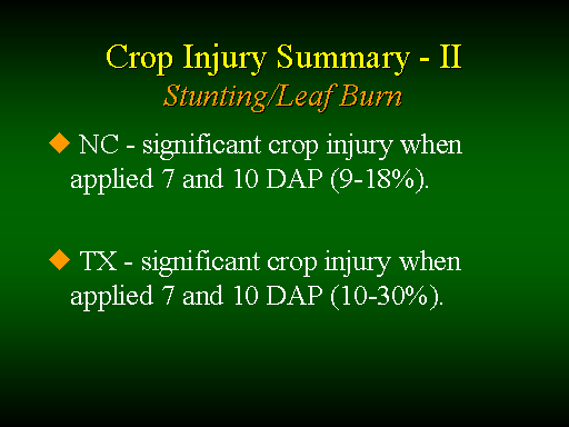 <BR> TX - significant crop injury when applied 7 and 10 DAP (10-30%). <BR>