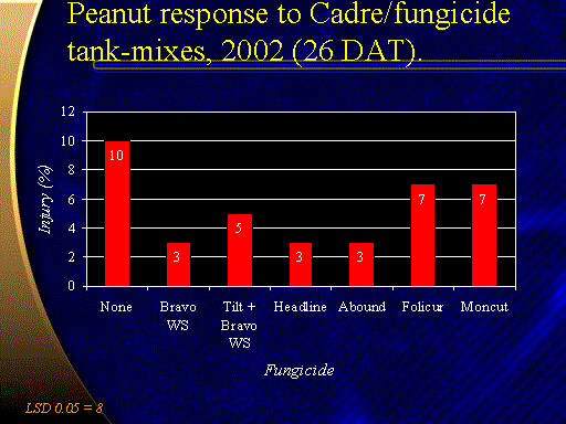 Peanut response to Cadre/fungicide tank-mixes, 2002 (26 DAT).<BR>LSD 0.05 = 8<BR>
