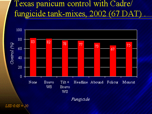 Texas panicum control with Cadre/ fungicide tank-mixes, 2002 (67 DAT) .<BR>LSD 0.05 = 20<BR>