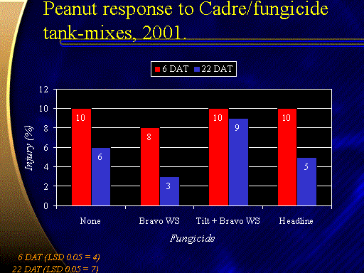 Peanut response to Cadre/fungicide tank-mixes, 2001.<BR>  6 DAT (LSD 0.05 = 4)