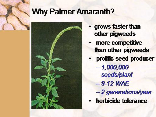 Why Palmer Amaranth?<BR>grows faster than other pigweeds <BR> more competitive than other pigweeds <BR> prolific seed producer <BR>1,000,000 seeds/plant <BR>9-12 WAE <BR>2 generations/year <BR> herbicide tolerance <BR>
