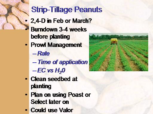 Strip-Tillage Peanuts<BR>2,4-D in Feb or March? <BR>Burndown 3-4 weeks before planting <BR>Prowl Management <BR>Rate <BR>Time of application <BR>EC vs H20 <BR>Clean seedbed at planting <BR>Plan on using Poast or Select later on <BR>Could use Valor<BR>