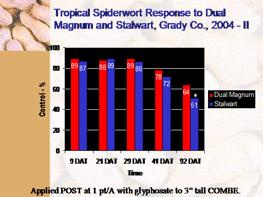 Tropical Spiderwort Response to Dual Magnum and Stalwart, Grady Co., 2004 - II<BR>Applied POST at 1 pt/A with glyphosate to 3” tall COMBE.<BR>*<BR>