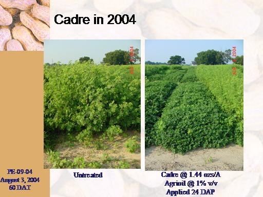 Cadre in 2004<BR>PE-09-04 <BR>August 3, 2004 <BR>60 DAT<BR>Untreated<BR>Cadre @ 1.44 ozs/A <BR>Agrioil @ 1% v/v <BR>Applied 24 DAP<BR>